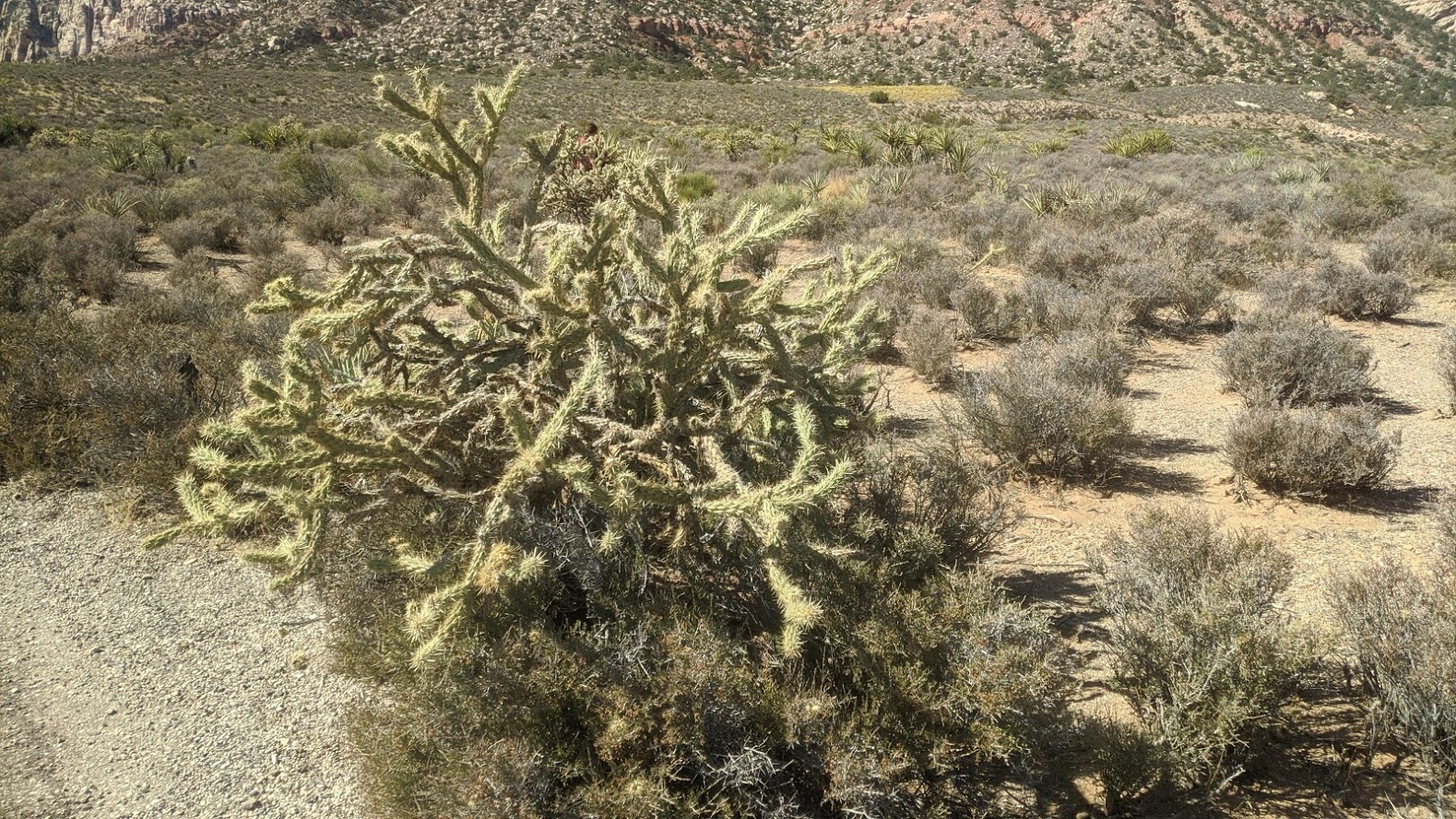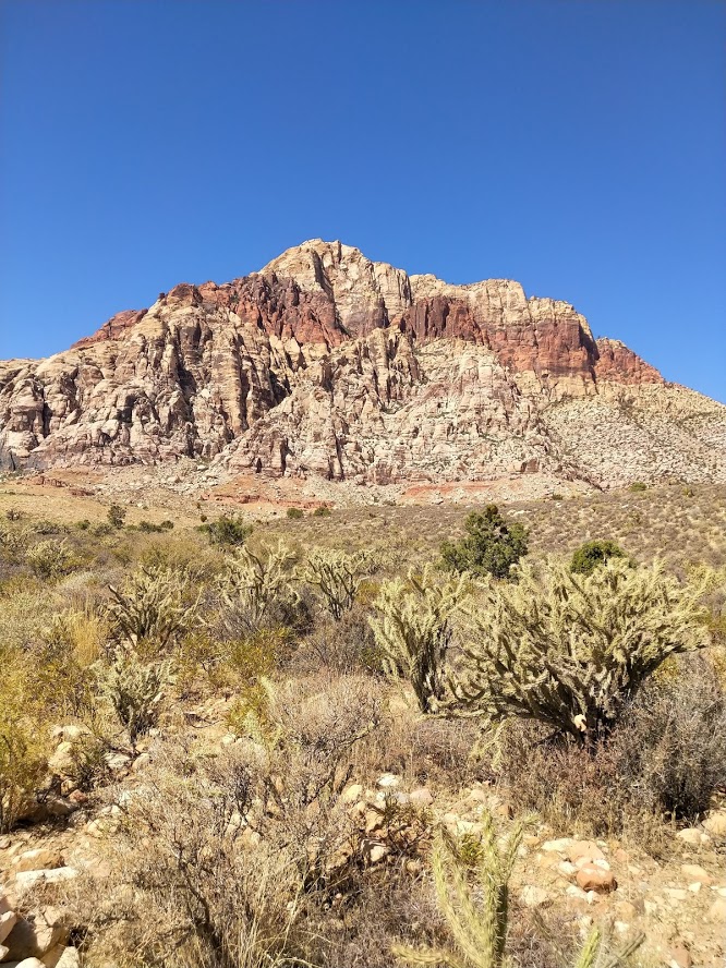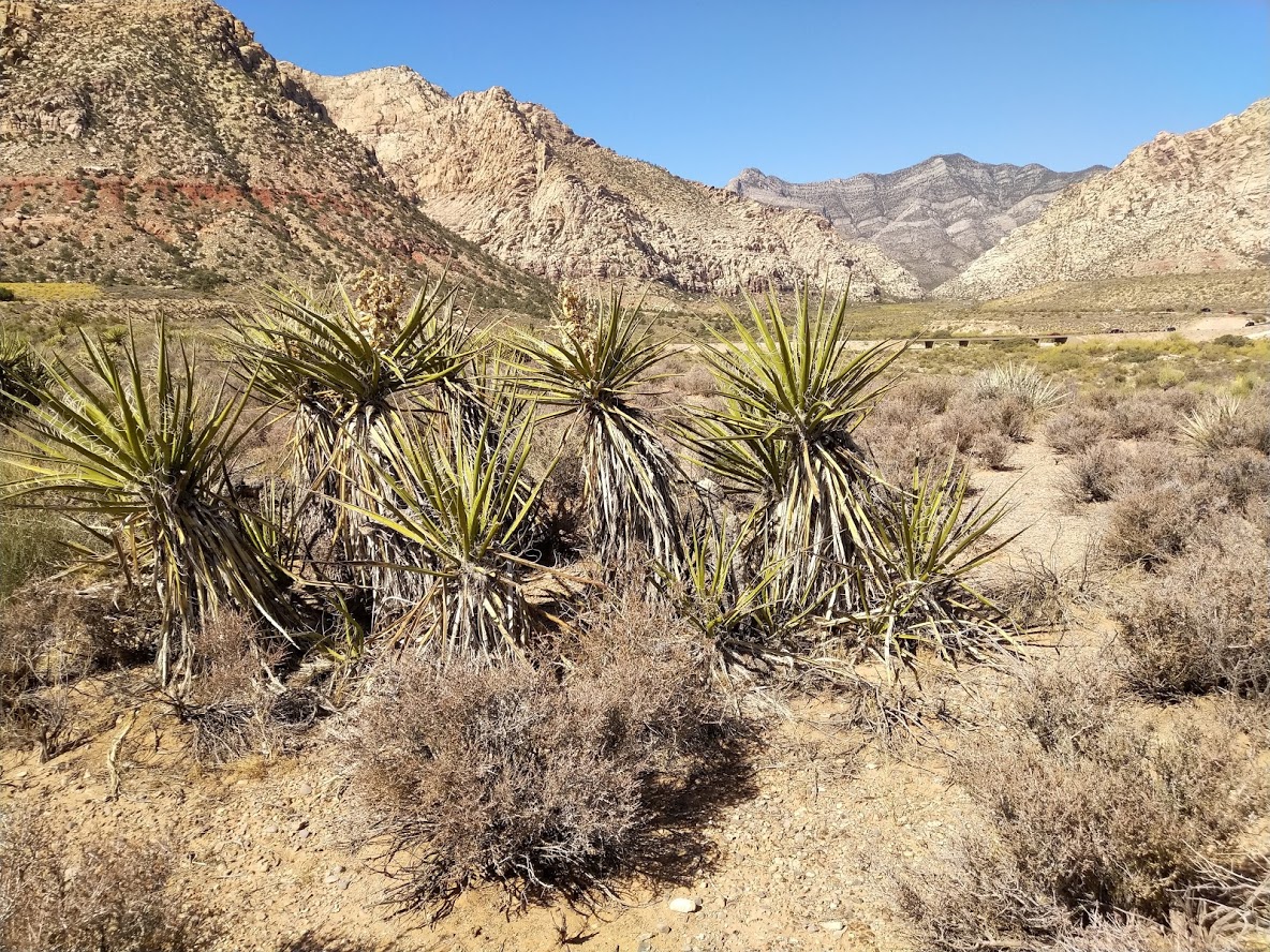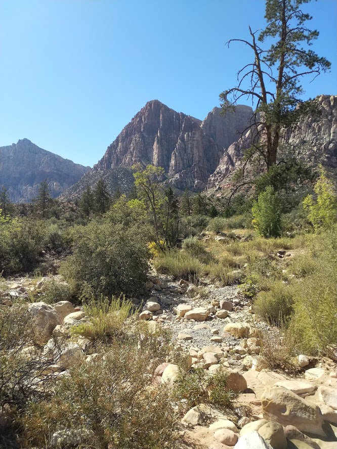 My daughter now lives in Nevada, near Las Vegas. The last time I was in Vegas I sat in a pool all day sipping mojitoes, but have no love for the Vegas strip. Neither does my daughter. It’s a place that represents the shiny things people love, which take them away, in my mind, from the more genuine things in life. So we went to visit her over the long Canadian Thanksgiving weekend and spent time enjoying the desert again. We hiked in Red Rock Canyon, including the Fire Ecology trail, which is a tiny trail that’s part of the much longer trail, but it was neat back there because it runs into Pine Creek Wash–which mostly at this time of year is dry, though we did see some water near some cattails. Because of the fact that little wash gets rain sometimes, there were also some trees back there, which was nice because it was pretty hot during the day and being in the shade was cooling.